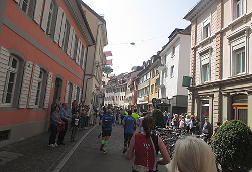 Hier flossen die berühmten Freiburger Bächle. Das Kopfsteinpflaster, von dem vorher stöhnend Laufblogger früherer Läufe berichtet hatten, empfand ich als nicht so schlimm. Klar, schnelle Läufer mögen so etwas nicht, und es zwingt zu erhöhter Konzentration, aber, hey, wir sind ja nicht in Monza auf der Rennstrecke!